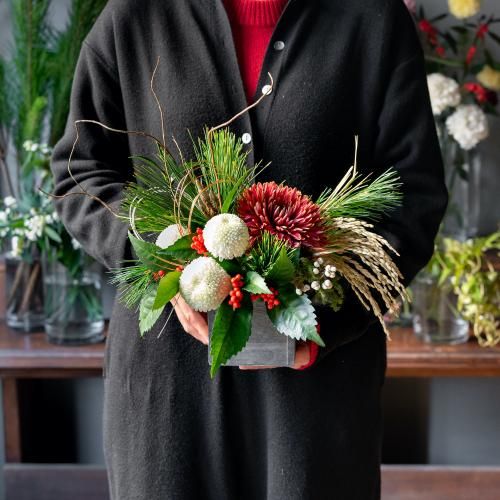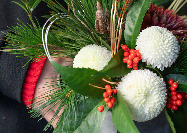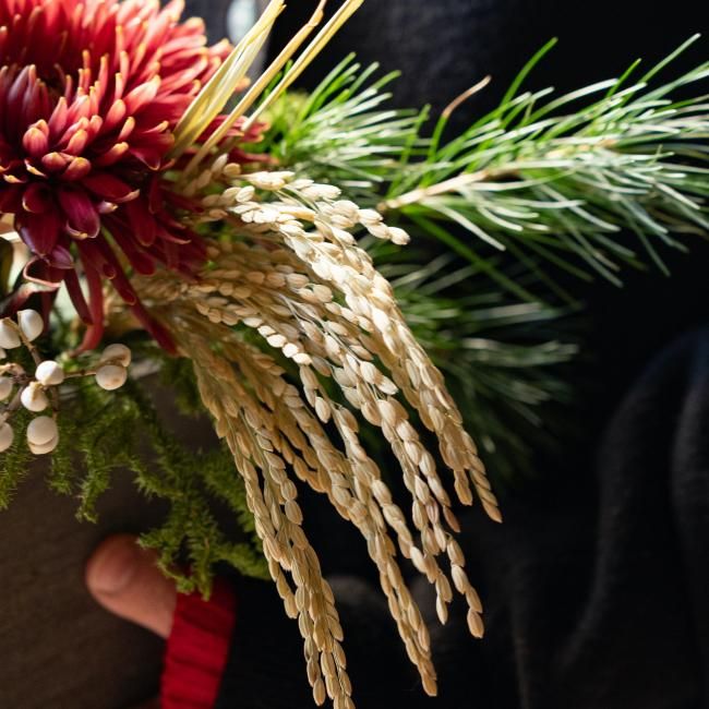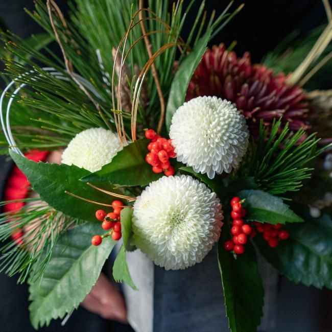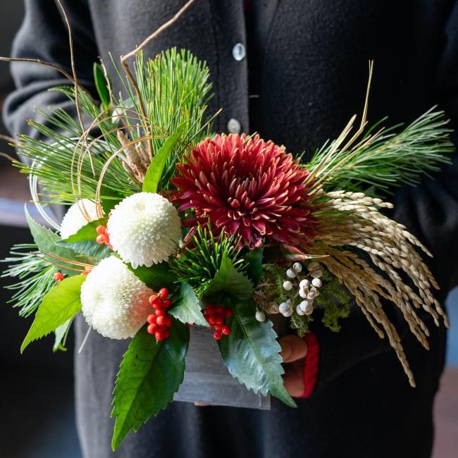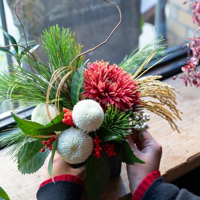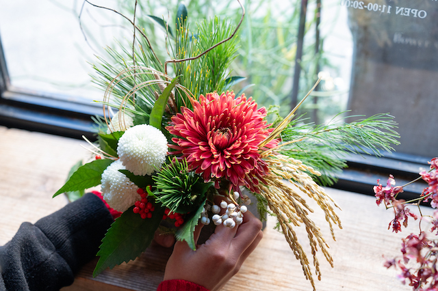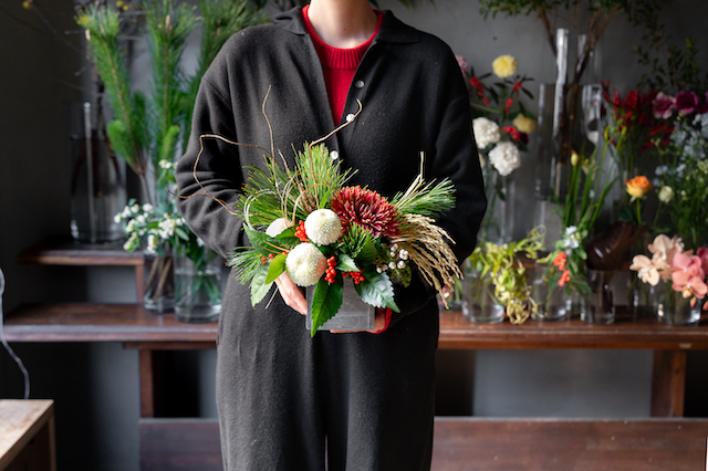 松、千両、菊など正月花として古くから親しまれてきた和花をベースに、
