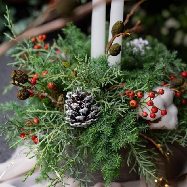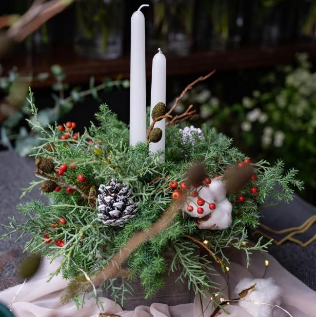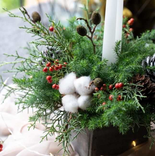 グリーンに合わせるのは、艶やかな赤い実ものや温かみを感じるコットン、純白のキャンドル。ホワイトクリスマスを連想させるデザインです。